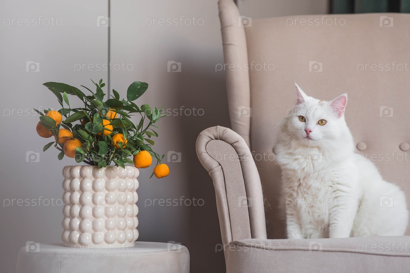 Молодой белый пушистый кот сидит на бежевом стуле в гостиной