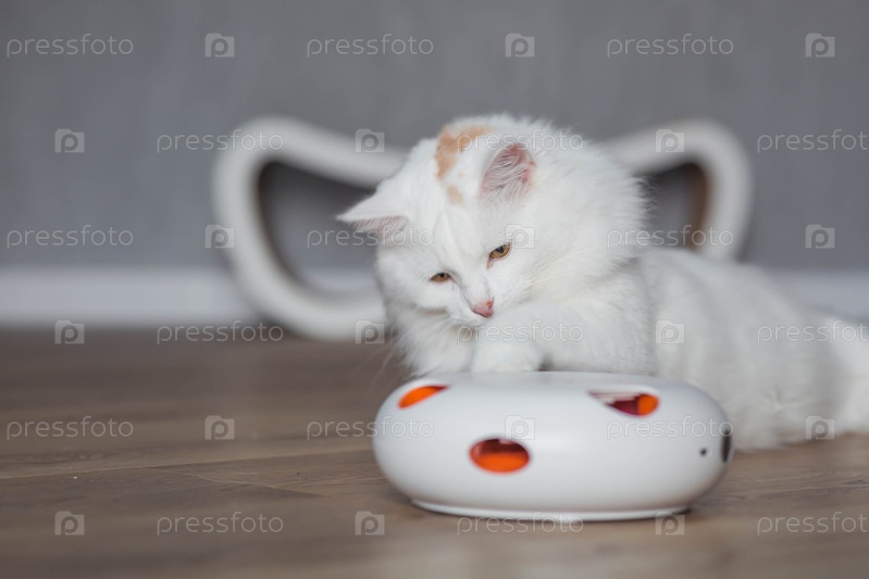 Молодой белый пушистый кот играет с электронной игрушкой. гаджеты для домашних животных. уход и обслуживание