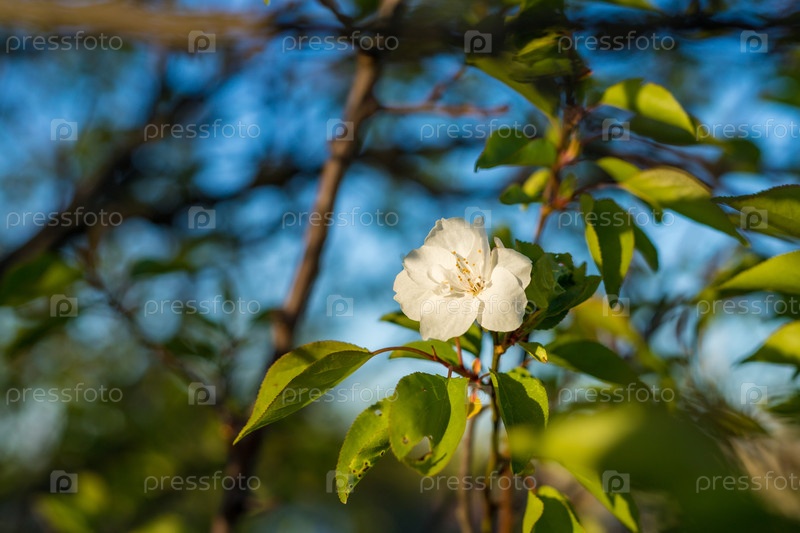 Ближайший снимок нежного белого цветка в полном цветении, обрамленного ярко-зелеными листьями и ветвями с размытым голубым небом на заднем плане