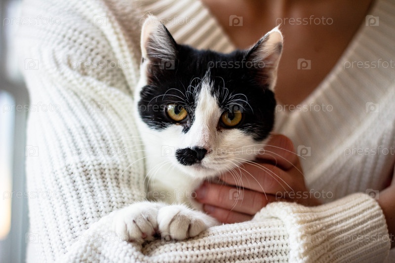 Черно-белый кот в руках женщины смотрит на камеру.Кот на белом фоне вязаного свитера.Всемирный день домашних животных.Защита животных, уход за ними