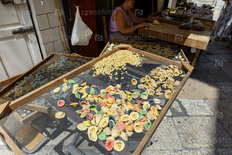 Италия. Бари. Женщины готовят макароны на улице Арко-Бассо. Италия. Бари. Женщины, готовящие макаронные изделия на улице Arco Basso
