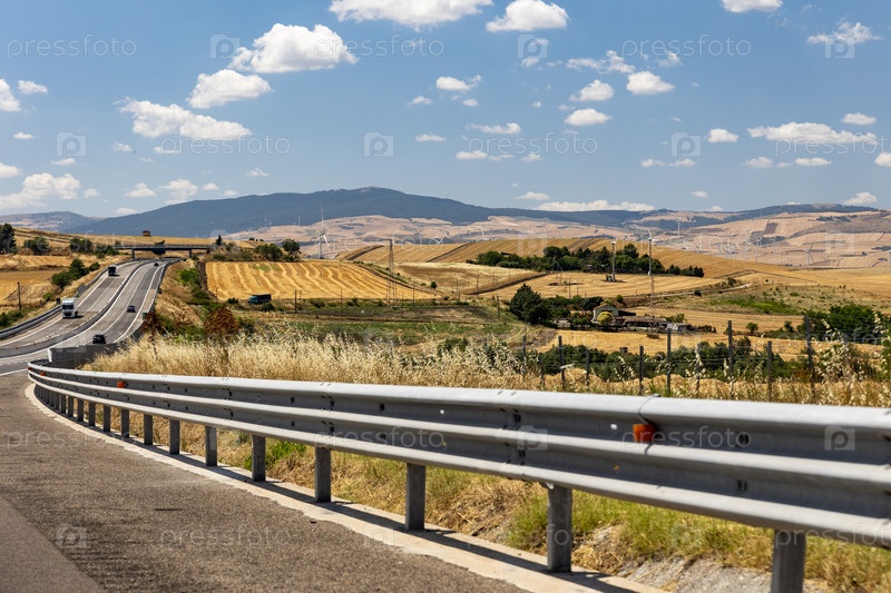 Италия. Аппулия. Дорога с видом на горы и поля. Италия. Аппулия. Дорога с видом на горы и поля