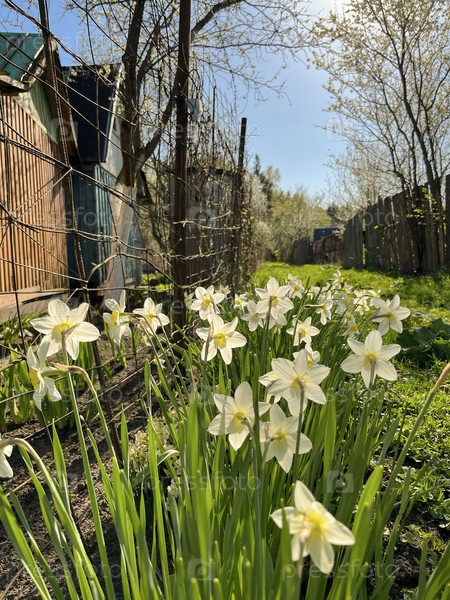 Белые нарциссы цветут в саду весной, Беларусь