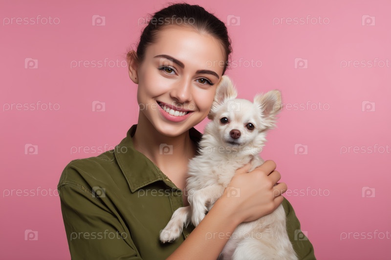 Улыбающаяся молодая женщина держит щенка чихуахуа изолированного на розовом