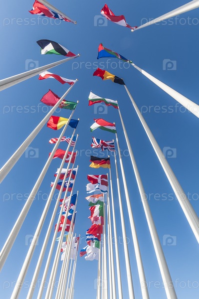 Флаги разных стран на флагштоках против чистого неба