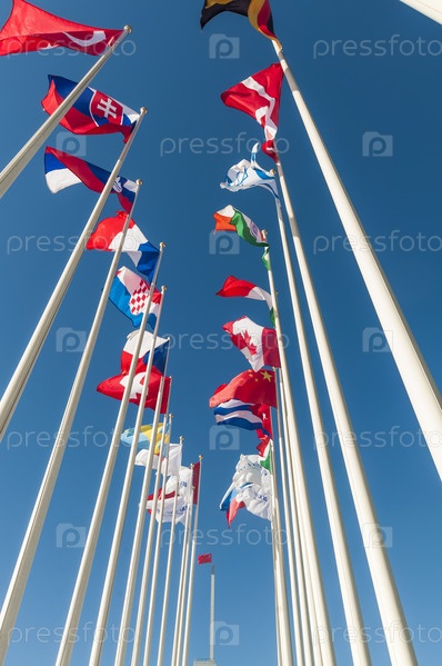 Флаги разных стран на флагштоках против чистого неба