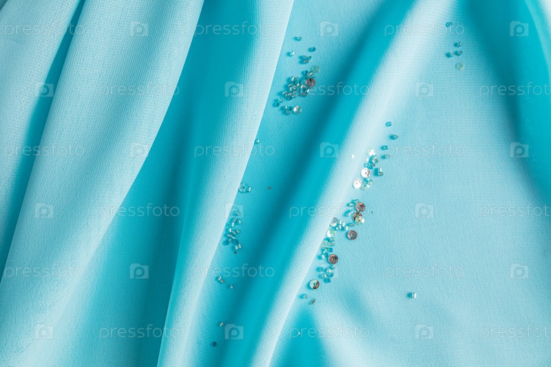Нежные, мягкие складки бирюзового шелка с разбросанными между ними ленточками и жуками. Вид сверху. Праздничная компоновка для дизайна. Шёлковая текстура