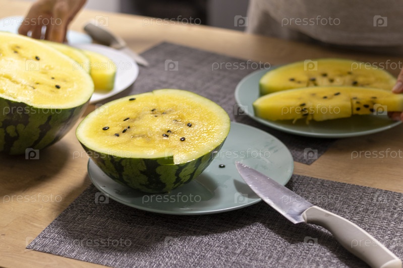 Закройте выстрел нарезанной арбузы с желтой плотью на керамической пластине