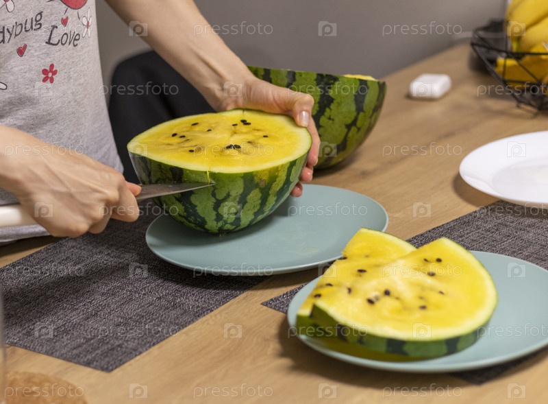 Мужчина разрезает арбуз желтой плотью