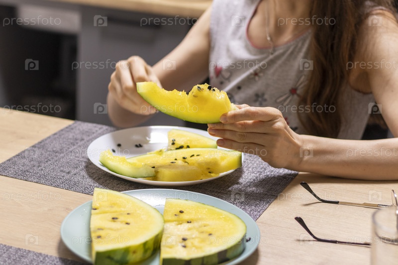 Женщина ест арбуз с желтой плотью
