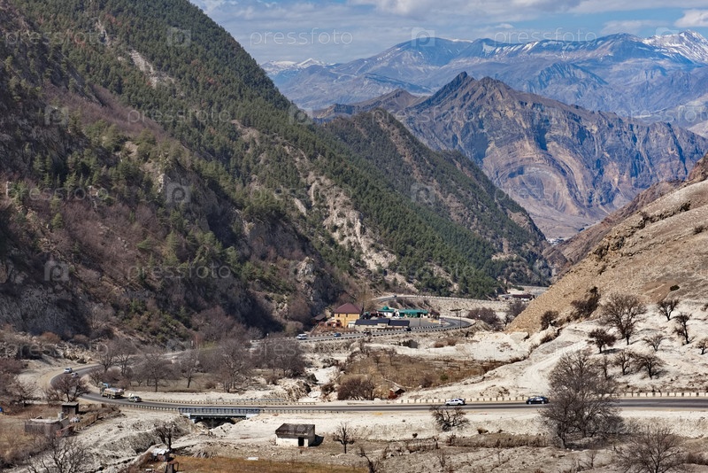 Живописный вид на шоссе Буйнакск-Чирката в районе выхода из тоннеля Гимри под горным хребтом Гимры