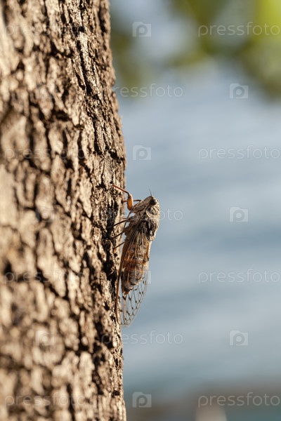 Цикада (Tibicen haematodes) на коре дерева в ближайшем плане
