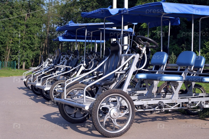 Четырехколесные четырехместные велосипедные вагоны стоят и ждут клиента в парке.Россия Воронежская область 13 июля 2025