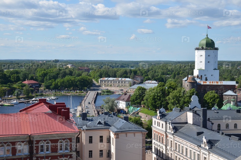 Вид на Выборгский замок, башню Святого Олафа и город Выборг с смотровой площадки часовой башни