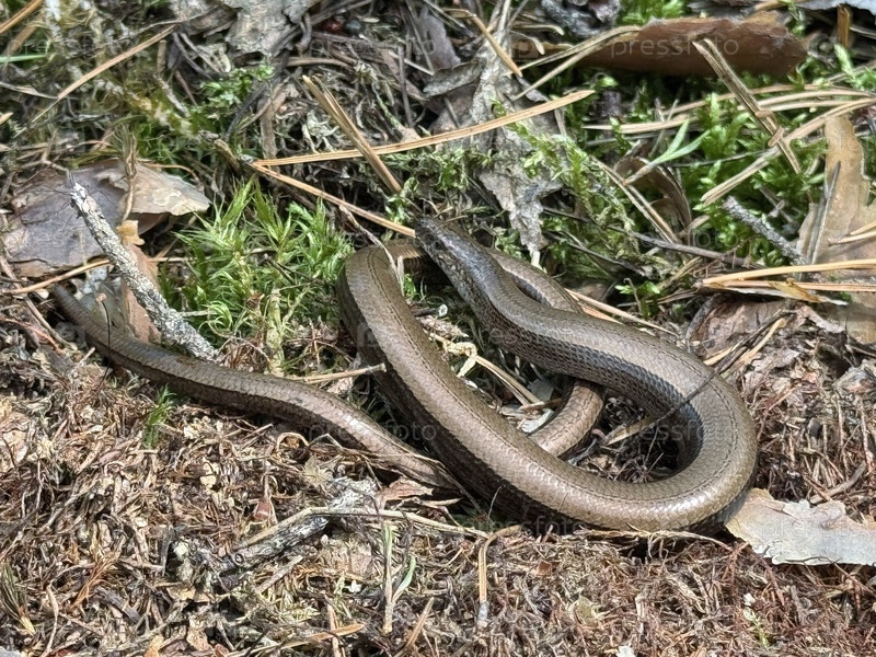 Медленный червь греется в лесу под солнечным светом