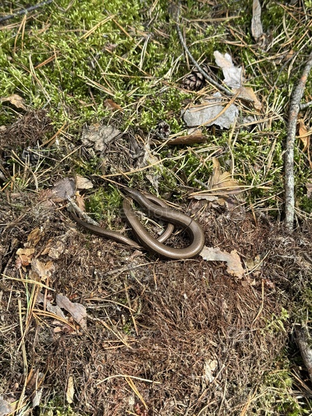 Медленный червь греется в лесу под солнечным светом