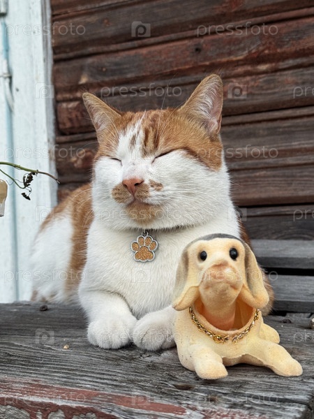Имбирь и белый кот спят на деревянной коробке