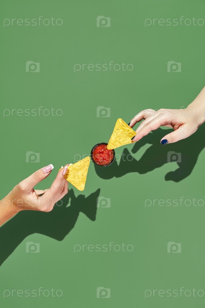 Две женские руки тянутся друг к другу с чипсами начо над миской соуса для сальсы