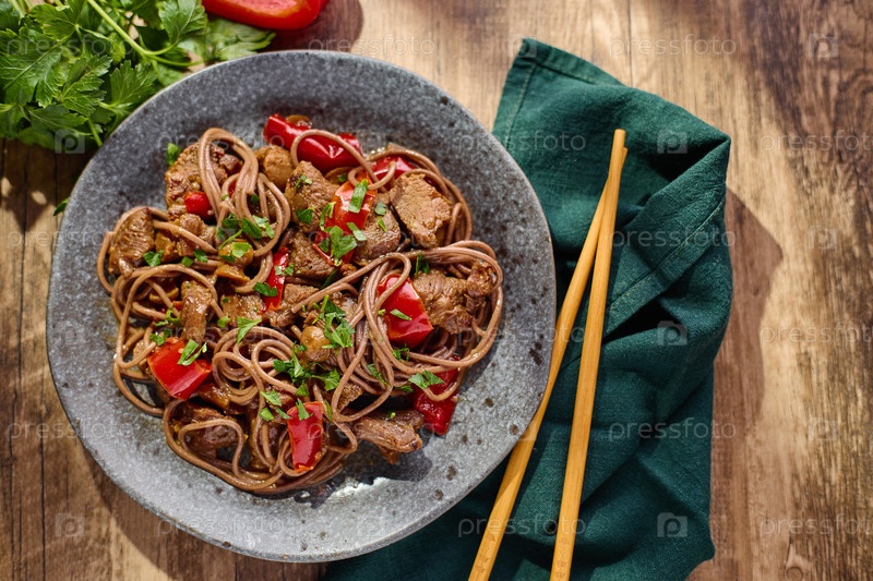 Вок с собойской лапшой с индейкой, грибами и сладким красным перцем в тарелке на деревянном столе под солнцем. азиатская еда и уличная кухня. вид сверху