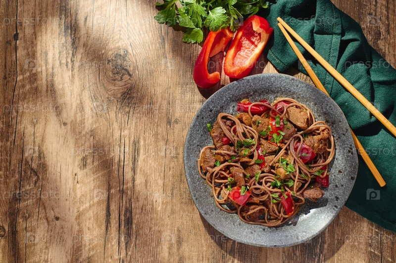 Вок с собойской лапшой с индейкой, грибами и сладким красным перцем в тарелке на деревянном столе под солнцем. азиатская еда и уличная кухня. вид сверху