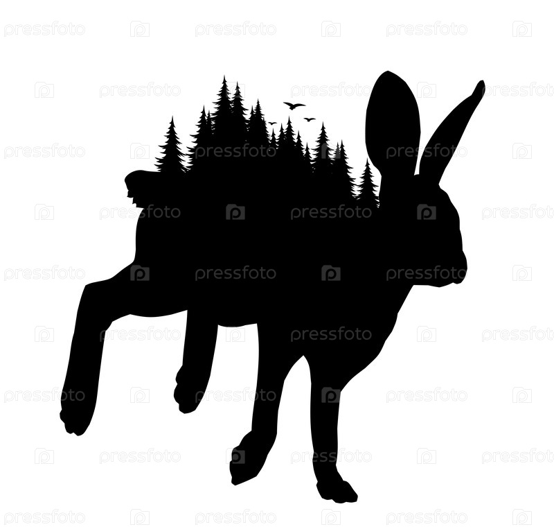 Силуэт дикого зайца с хвойным лесом