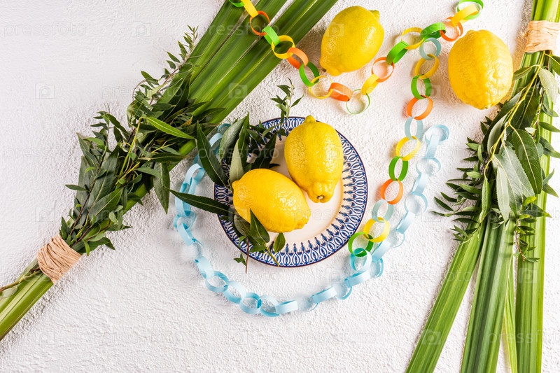 Традиционные символы еврейского праздника Суккот фрукты на тарелке. цитрусовый этрог, пальмовые листья, ива и мирта, красочные гирлянды
