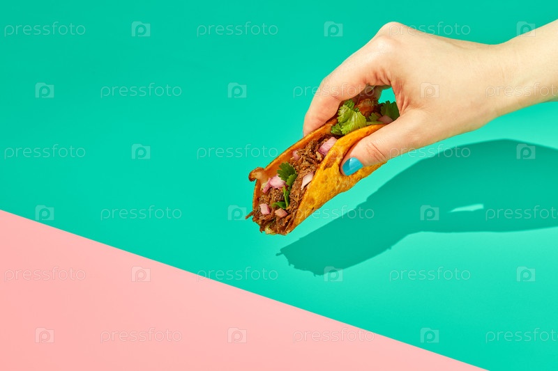 Женская рука держит тако на цветном фоне.Концепция мексиканской кухни