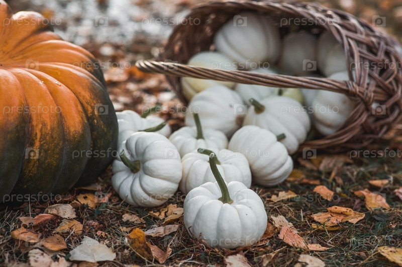 Осенний фон белых декоративных тыквен в плетеновой корзине. Богатый урожай. Концепция Хэллоуина или Дня благодарения