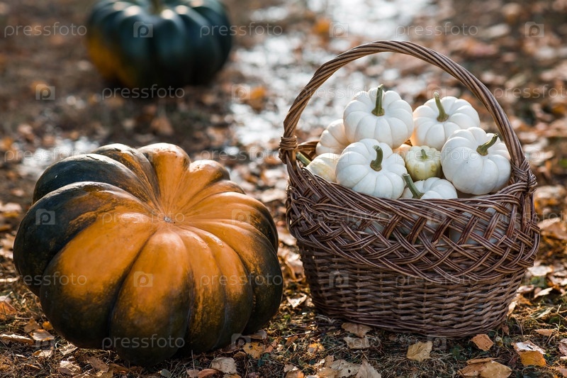 Осенний тыквенный фон. Белые тыквы в корзине из косточки. Богатый урожай. Концепция Хэллоуина или Дня благодарения