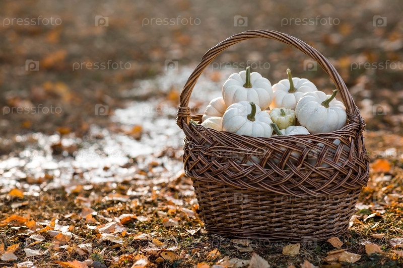 Осенний фон белых декоративных тыквен в плетеновой корзине. Богатый урожай. Концепция Хэллоуина или Дня благодарения