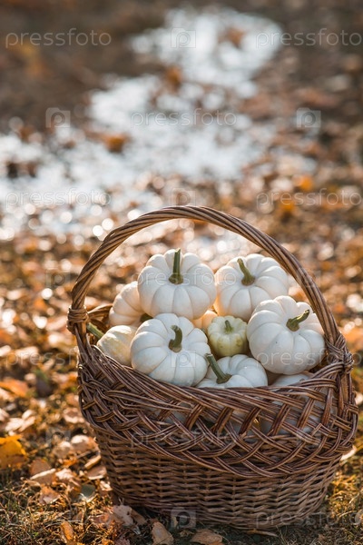 Осенний фон белых декоративных тыквен в плетеновой корзине. Богатый урожай. Концепция Хэллоуина или Дня благодарения