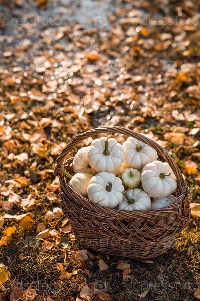 Осенний фон белых декоративных тыквен в плетеновой корзине. Богатый урожай. Концепция Хэллоуина или Дня благодарения
