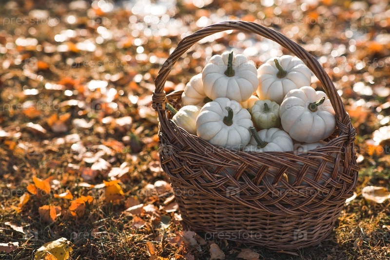 Осенний фон белых декоративных тыквен в плетеновой корзине. Богатый урожай. Концепция Хэллоуина или Дня благодарения
