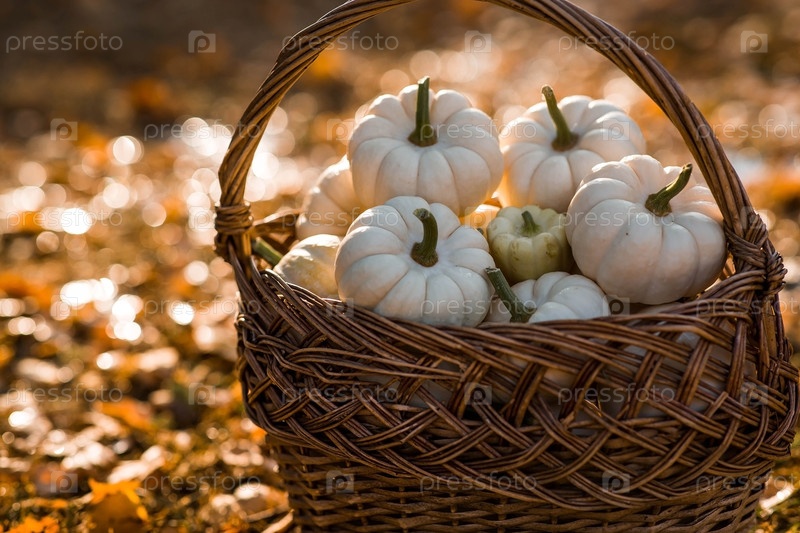 Осенний фон белых декоративных тыквен в плетеновой корзине. Богатый урожай. Концепция Хэллоуина или Дня благодарения