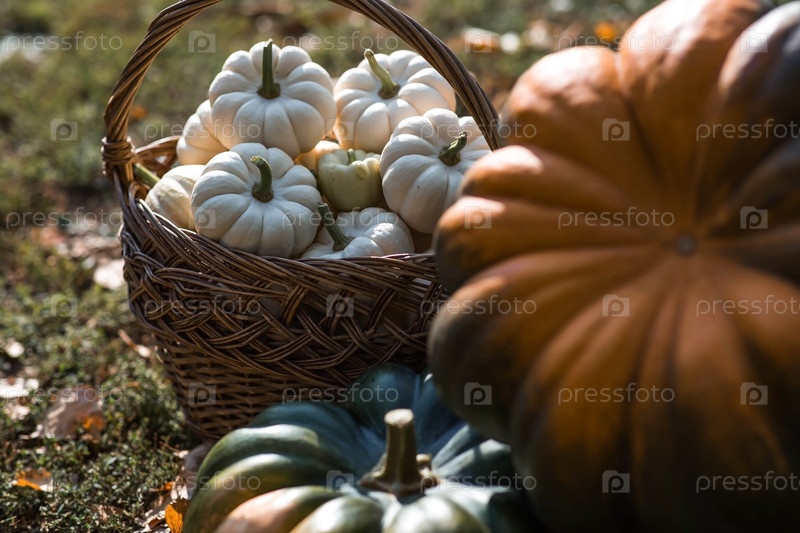 Осенний тыквенный фон. Белые тыквы в корзине из косточки. Богатый урожай. Концепция Хэллоуина или Дня благодарения