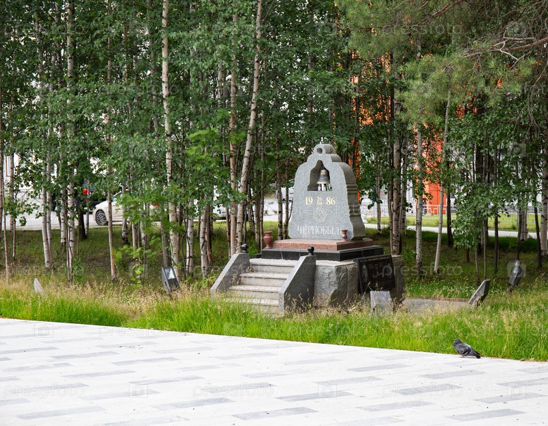 Памятник ликвидации аварии на Чернобыльской АЭС на улице Ленина в городе Нойярск летом