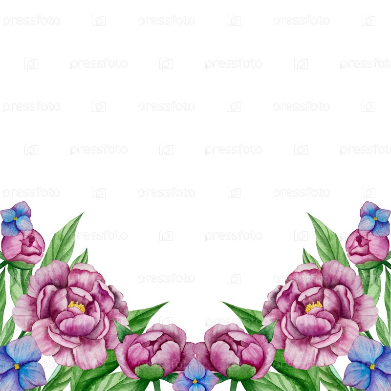Розовые садовые цветы изолированы на белом фоне, акварельная иллюстрация. розовая букет цветов, бордонские пионы границы. фиолетовый гидрензия, рама, венок. летний дизайн. свадебное приглашение