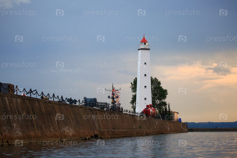 Кронштадт. вечерний летний вид на стену Петровского канала с белым старым маяком