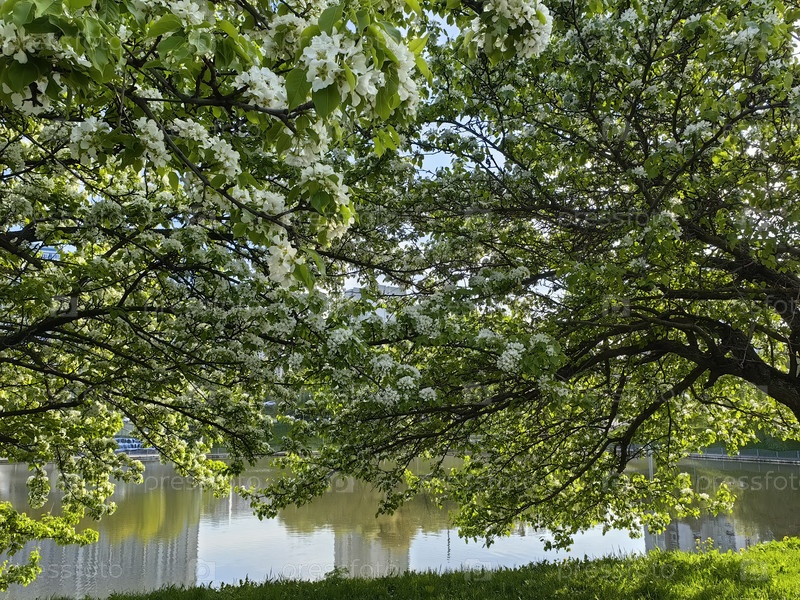 Дерево с белыми цветами и зелеными листьями на воде