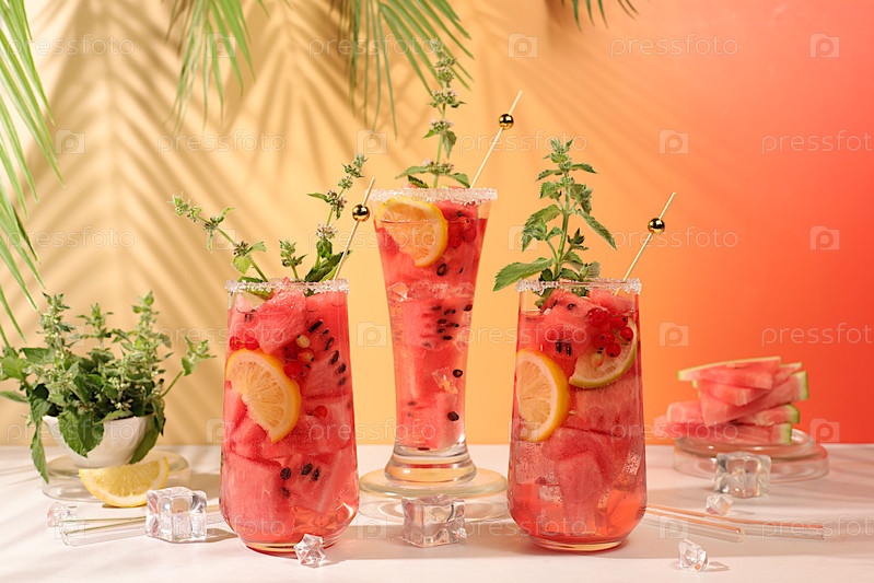 Холодный домашний лимонад, сангрия или коктейль с мятой, арбузом, абрикосом, лимоном и фруктами, рецепт освежающего летнего напитка, детоксикационная диета и концепция похудения, меню ресторана, выборочный подход