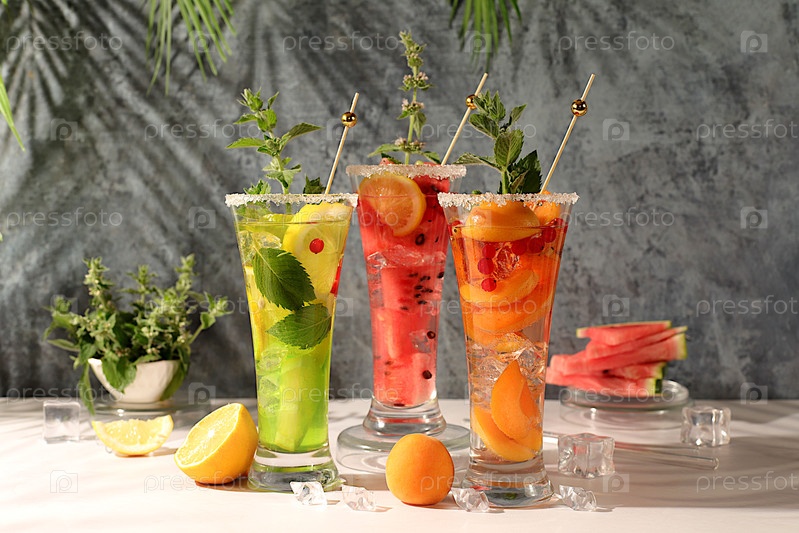 Освежающий летний домашний коктейль, сангрия, лимонада с арбузой, абрикосом, смородиной, мятой и лимоном, концепция похудения, здоровое и естественное питание, детоксикационная вода с фруктовым вкусом на светлом фоне