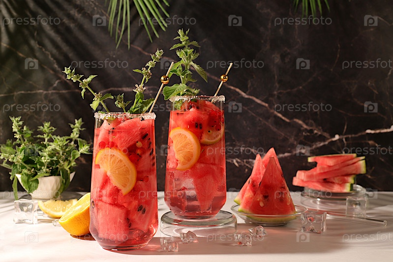Освежающий летний домашний коктейль, сангрия, лимонада с арбузой, абрикосом, смородиной, мятой и лимоном, концепция похудения, здоровое и естественное питание, детоксикационная вода с фруктовым вкусом на светлом фоне