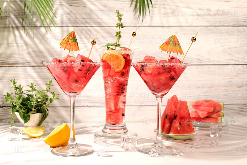 Современный натюрморт с алкогольным коктейлем из арбуза, абрикосового лимона, льда, текилы, водки и мяты на элегантном фоне, минималистическая концепция бара, рецепт испанской сангрии, рекламный баннер для кафе