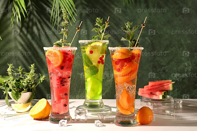 Современный натюрморт с алкогольным коктейлем из арбуза, абрикосового лимона, льда, текилы, водки и мяты на элегантном фоне, минималистическая концепция бара, рецепт испанской сангрии, рекламный баннер для кафе