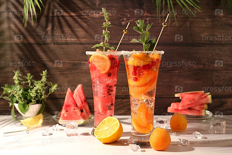 Холодный домашний лимонад, сангрия или коктейль с мятой, арбузом, абрикосом, лимоном и фруктами, рецепт освежающего летнего напитка, детоксикационная диета и концепция похудения, меню ресторана, выборочный подход