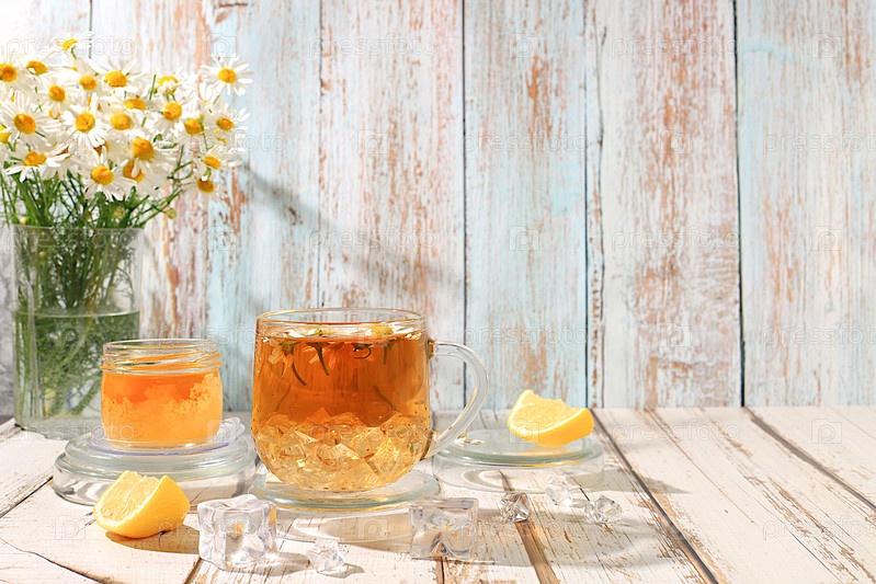 Чай из ромашки или инфузия с лимоном, медом и льдом в прозрачных бокалах с естественными маленькими цветами ромашки на деревенском столе, концепция терапевтического травяного чая и правильного натурального питания