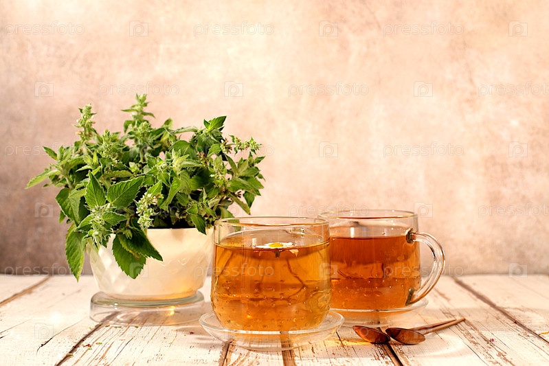 Лимонный мятный чай на деревянном столе, букет диких лекарственных трав, коллекция полезных трав для лечения по народным рецептам.Концепция альтернативной медицины, реклама зеленой аптеки
