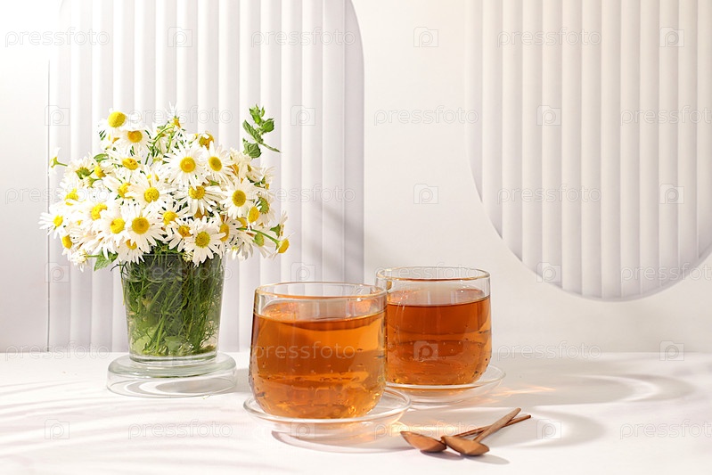 Чай из ромашки или инфузия в прозрачных бокалах с естественными маленькими цветами ромашки на элегантном столе, концепция терапевтического травяного чая и правильного натурального питания, летняя открытка