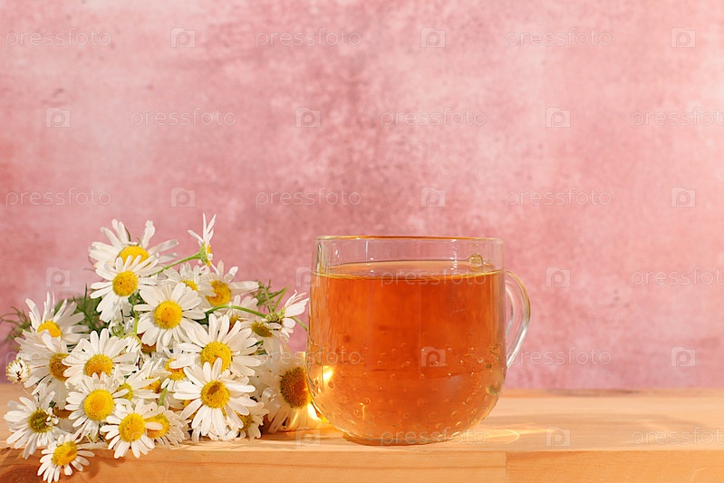 Чай из ромашки или инфузия в прозрачных бокалах с естественными маленькими цветами ромашки на деревянном столе, концепция терапевтического травяного чая и правильного натурального питания, летняя открытка
