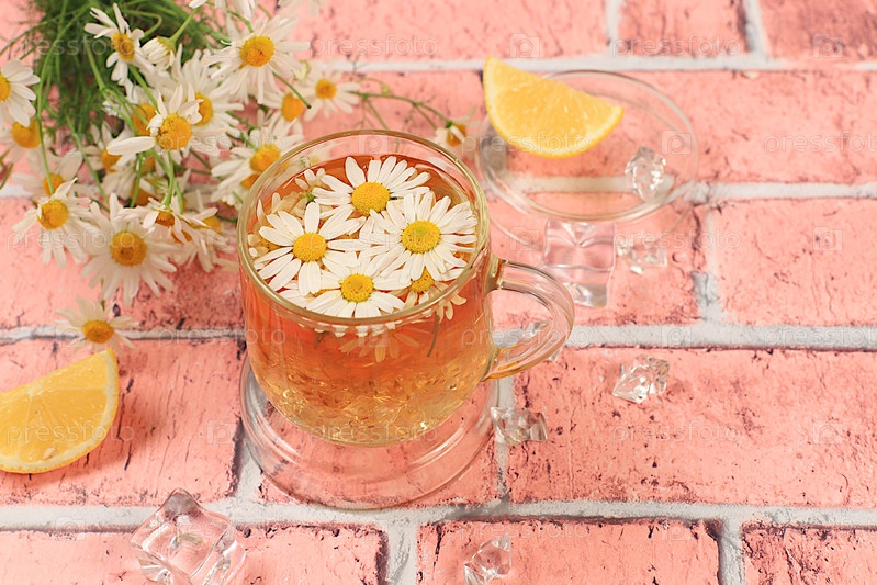 Чай из ромашки или настой с лимоном и медом в прозрачных стеклах с натуральными маленькими цветами ромашки, концепция терапевтического травяного чая и правильное естественное питание, летняя открытка